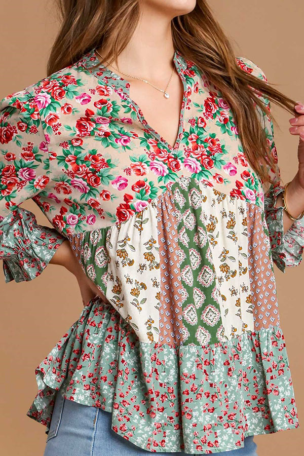 FLORAL PRINT CONTRAST PAISLEY YOKE BLOUSE TOP